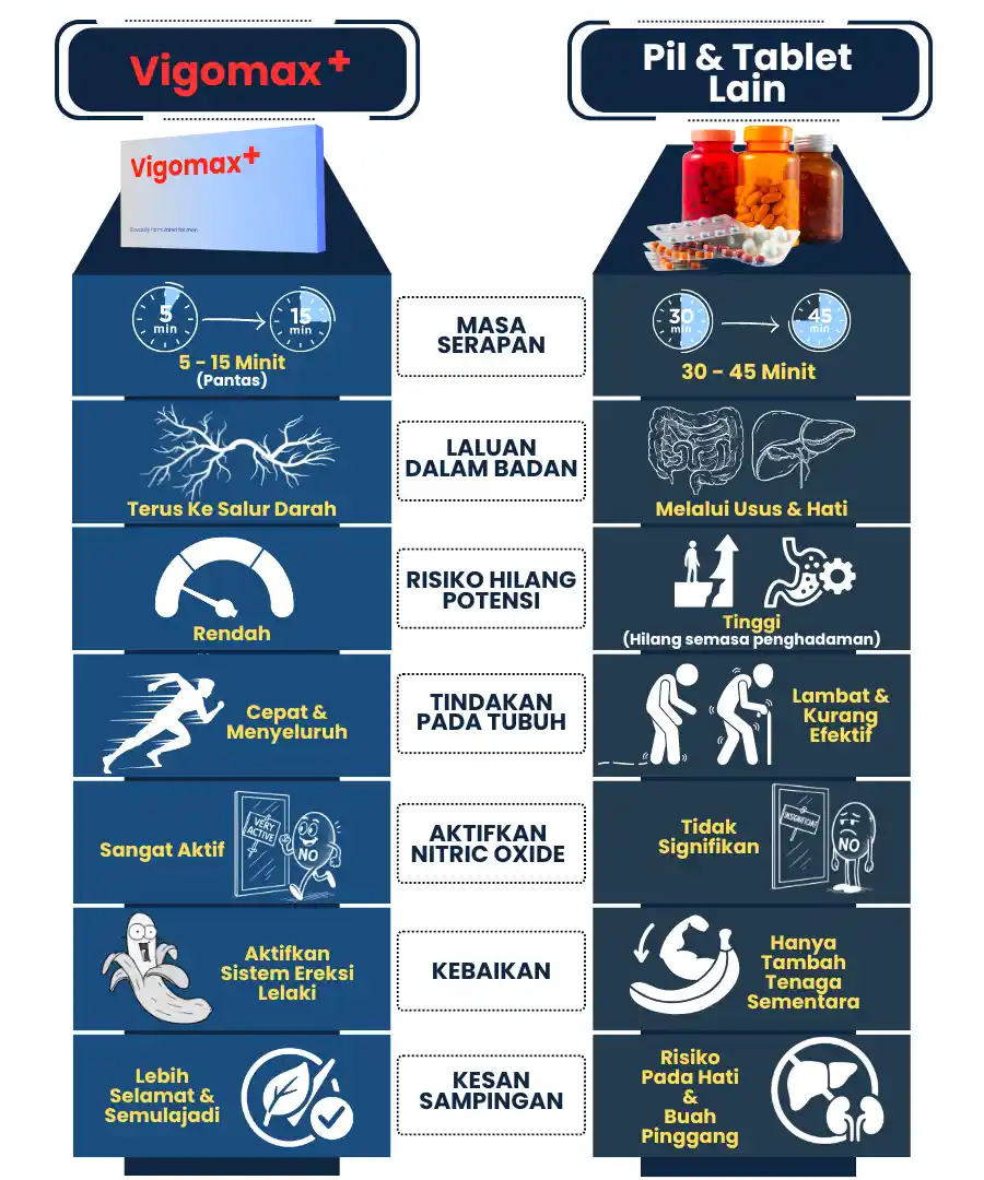 Bukan. Vigomax+ bukan ubat kuat. Ia adalah oral film teknologi baru yang bantu aktifkan semula Nitric Oxide (NO) — kunci utama sistem ereksi lelaki.